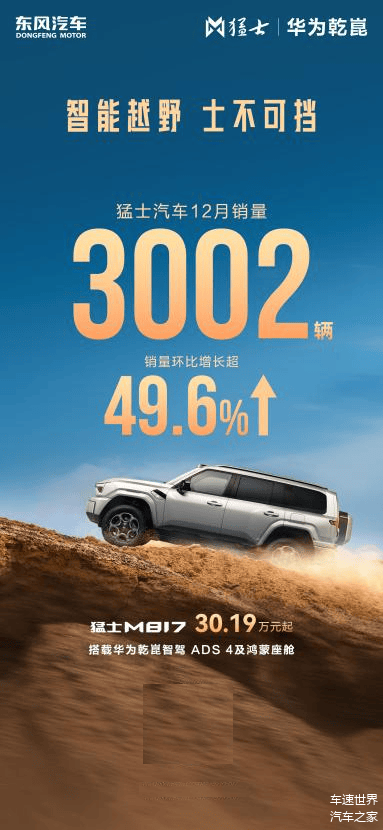 作为豪华智能越野赛道的标杆之作,猛士M817自8月上市后,迅速跻身豪华新能源越野第一阵营,并且仅用4个月便达成万台下线,创下了高端新能源越野车型量产速度的新纪录,同时在其带动下,猛士汽车自9月起销量强势实现“四连涨”。12月销量更是达到3002台,销量环比增长49.6%。
