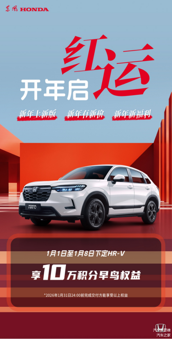 2026年元旦假日第一天,东风本田公布了HR-V全新版本,Pro 版和 Max 版将在1月8日焕新发布,同时带来吸睛的福利政策——1月1日-1月8日期间下定HR-V,即可获得东风本田APP商城10万积分的专属新年早鸟购车权益。