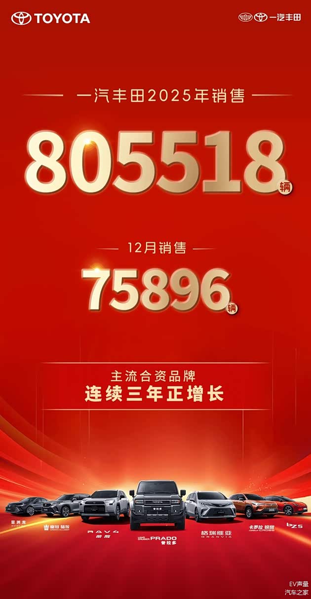 回首未及尘封的2025年,机遇与挑战并存,笃定与奋进同在;一汽丰田不负春华,硕果累累,全年销售新车805518辆,成为连续三年实现正增长的主流合资品牌,品牌向上向新的势头更加明显。其中TNGA-K平台以上高端车型销售487426辆,同比增长12%,占比达61%;智能电混双擎全年销量380100辆,同比增长14%,占比达47%。明星车型皇冠陆放全年销售59902辆,同比增长14%;RAV4荣放全年销售204272辆,同比增长6%;亚洲龙全年销售126703辆,同比增长39%,展示了强劲的向上势头。