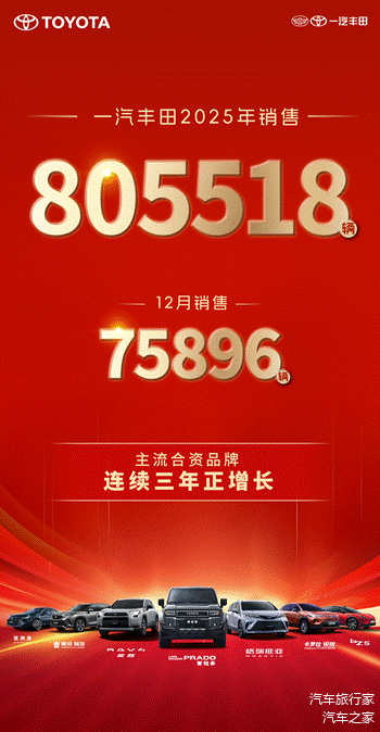 2025年一汽丰田新车销售805518辆,成就连续三年正增长主流合资车企