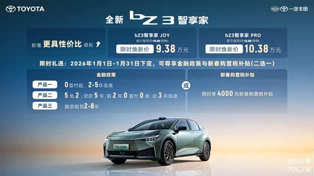 2025年12月31日,一汽丰田举办智电bZ双车焕新发布会;公布bZ3智享家 JOY版和bZ3智享家 PRO版限时焕新价分别为9.38万元和10.38万元。同时,在2026年1月1日-1月31日期间下定的用户,限时额外享4000元新春购置税补贴,或者包括0首付,2~5年低息;贷款5年,前两年0首付0息,后3年低息的“5免2”等在内的金融政策福利。