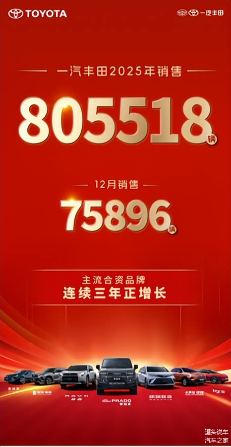 2025年是一汽丰田发展过程中关键的一年,不仅实现了连续三年销量正增长,还在产品布局、技术升级与组织管理方面完成了一系列调整优化。油电并行的产品策略、IT'S TiME 3.0技术品牌的升级、用户长期价值保障机制的落地,以及产销研一体化运营的深化,为品牌穿越市场周期提供了支撑。从bZ5开启本土化战略新起点,到天津迁址实现资源整合,一汽丰田正从全球标准的执行者,逐步转型为深度适配中国市场的合资品牌。2026年已拉开序幕,智电市场竞争进入新阶段,凭借焕新的产品矩阵、进阶的核心技术与高效的运营体系,一汽丰田将持续稳步推进发展。