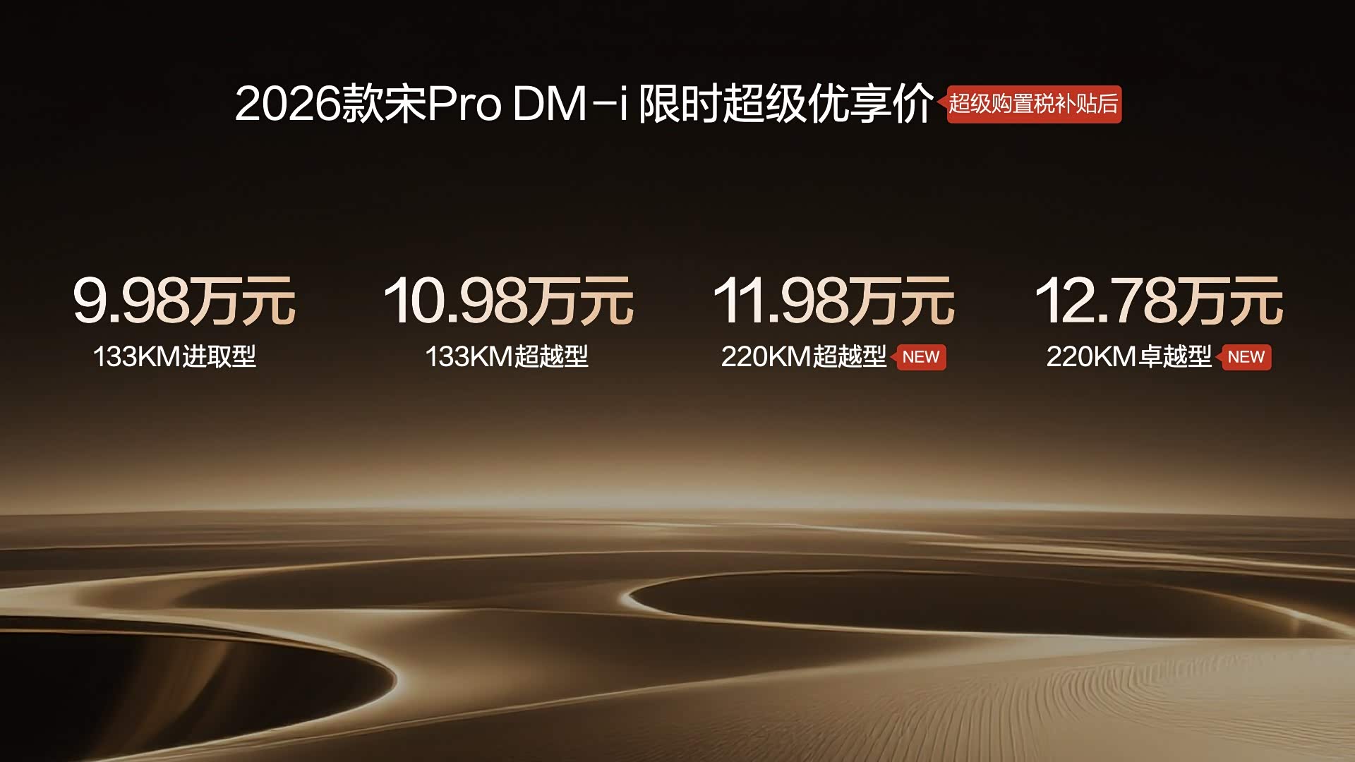 2026年初,比亚迪在插混市场持续发力,不仅为秦PLUS DM-i、秦L DM-i、海豹 05 DM-i及海豹06 DM-i四款热销车型加推 210km 长续航版,更是在1月10日2026款宋 Pro DM-i 220km 长续航版上市,限时优享价9.98-12.78 万元。 依托第五代DM技术与插混专用刀片电池,新车续航全面升级:宋 Pro DM-i 纯电续航达 220km,四款轿车纯电续航 210km,均实现翻倍提升,日常通勤可满足一周甚至两周一充。满油满电状态下,轿车综合续航超 2110km,宋Pro DM-i 达1600km,3.2L/百公里亏电油耗搭配低成本电费,彻底告别里程与成本焦虑。 配置上也是契合家庭需求,宋Pro DM-i搭载智能儿童安全座椅、冷暖冰箱、座椅通风加热等舒享配置,“天神之眼” 辅助驾驶与高速爆胎稳定系统筑牢安全防线。2026款宋Pro DM-i 以限时9.98-12.78万元的诚意价格,插混电力再加码,为消费者提供了更具价值的选择。