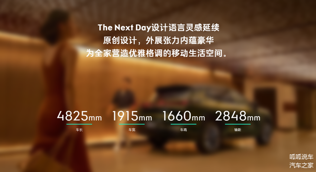 车身尺寸上,其定位中型SUV,采用5门5座布局,长宽高分别为4825mm×1915mm×1660mm,轴距为2848mm。储物空间方面,常规后备箱容积为545升,后排座椅放倒后可扩展至1277升。