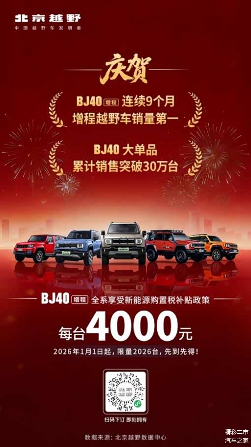2026年1月1日,北京越野行业首发“国补延续 BJ加码” 专项活动,以“国补+厂补”双重让利惠及用户,购BJ40增程全系车型至高享国补15000元,厂补4000元,全国限量2026台。