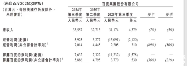 从核心财务指标来看,2025年前三季度百度实现营业收入963.39亿元,较上年同期实现增长,但其季度增速呈现“前低后升、逐季修复”的波动态势。