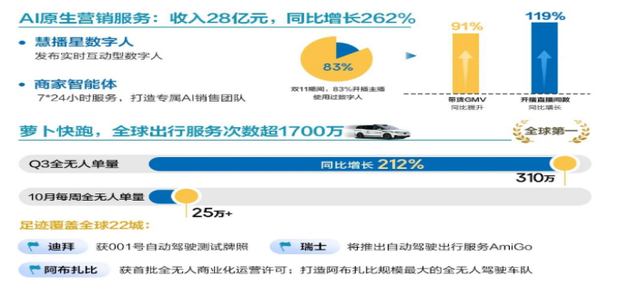 “萝卜快跑”商业化进程加速,三季度全球出行服务达310万次,累计服务超1700万次,覆盖22座城市,全无人驾驶里程突破1.4亿公里,且全程无安全员值守。李彦宏披露,其订单量是国内竞品的15倍,部分城市已实现正向单位效益,2026年将扩大覆盖范围,同时通过与Uber、Lyft合作,在迪拜等地区推进全球化运营布局。