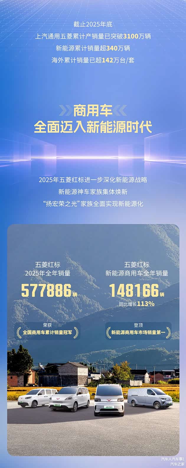 然后说到它的红标系列,2025年全年销量达到了577886台,荣获了全国商用车累计销量冠军,新能源商用车全年销量148166台,同比大涨113%,稳稳拿下新能源商用车市场销量第一。宝骏汽车也有强势的表现,2025年全年销量达到了492002台,同比增长12.3%。