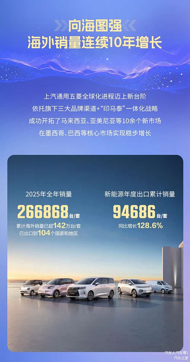 对于全球化,上汽通用五菱也一直在不遗余力的加快扩张,2025年全年,上汽通用五菱海外销量达到了266868台,目前海外累计销量已经达到了142万台,并且成功出口至104个国家和地区。