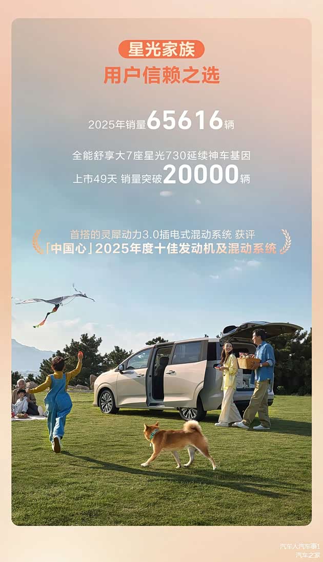 “灵”包括灵语座舱、灵眸智驾和灵犀动力3.0技术,都属于同级领先的水准,比如星光730搭载的灵犀动力3.0技术,斩获了“2025年度中国心十佳发动机及混动系统”与“中汽中心高品质混动认证”双料认证,它的馈电油耗达到了2L级别,领先行业。