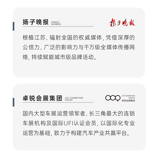 本届CMS南京车展由江苏省主流权威媒体《扬子晚报》与卓锐会展集团联合打造。强强携手,是为信赖赋能: