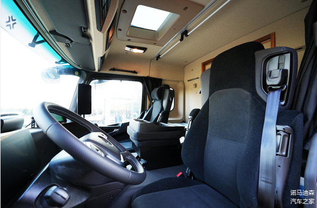 踏入“穿越者B”(长轴)的驾驶室,首先映入眼帘的便是主、副驾的空气悬挂座椅。这可不是普通的座椅,它们简直就是为长途驾驶量身定制的“舒适宝座”。空气悬挂系统能够有效过滤掉路面带来的颠簸感。当你行驶在崎岖的山路上,座椅如同有一双温柔的手,轻轻托着你,让你仿佛坐在云端,丝毫感受不到路面的起伏。除了空气悬挂以外,座椅还拥有电动按摩、加热和通风、多角度调节等多项功能,给足驾乘者多方位的呵护。而且,这整个驾驶室可乘坐 3 人(中间位置后装一张可折叠座椅),布局紧凑却不拥挤。不论是驾驶员专注驾驶,还是副驾位的同伴协助导航,亦或是中间位置的朋友一起谈天说地,都能找到舒适的坐姿。