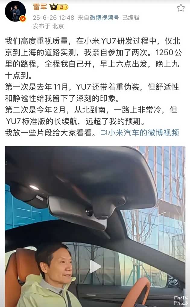 雷军进一步科普, 小米YU7标准版CLTC工况续航为835公里,而实际高速续航受天气、驾驶习惯等因素影响会有折损,通常是7-8折,冬季低温环境下折损可能达5-6折,此次1300km只充一次电是特定测试场景下的实测结果,并非官方续航承诺。