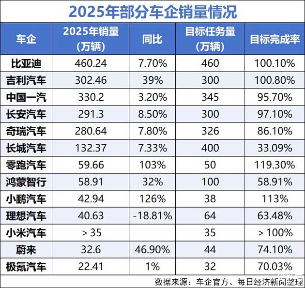 《每日经济新闻》记者综合已公布的2025年销量情况的车企数据发现,头部自主车企凭借产品矩阵与技术优势稳步领跑,部分企业超额完成年度目标;多数车企面临目标缺口压力,新势力阵营更是上演“冰火两重天”,仅有少数品牌顺利达标。