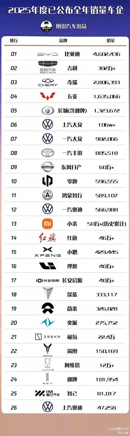 2026年1月初,国内车企陆续公布2025年销量成绩单。这份答卷清晰勾勒出行业新图景:传统车企加速新能源转型、规模化扩张;造车新势力经历残酷洗牌,座次剧烈更迭。从头部格局到细分赛道,2025年车市竞争烈度拉满。