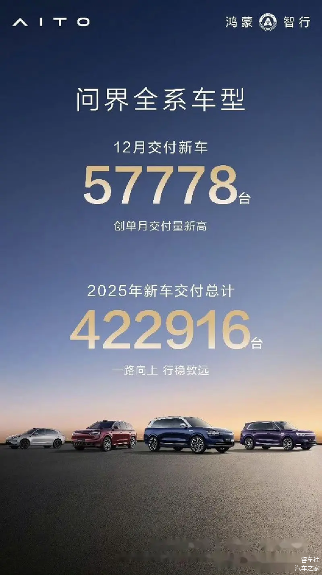 问界2025年累计交付新车422,916辆。旗下几款车型左右开弓,上市不久的问界M5交付超3万辆,问界M7交付超11万辆,问界M8表现格外优秀,交付超15万辆,问界M9交付超过11万辆。尤其是12月份,问界交付量达到57,778辆,更是格外优秀,预计2026年,问界销量将持续增长。