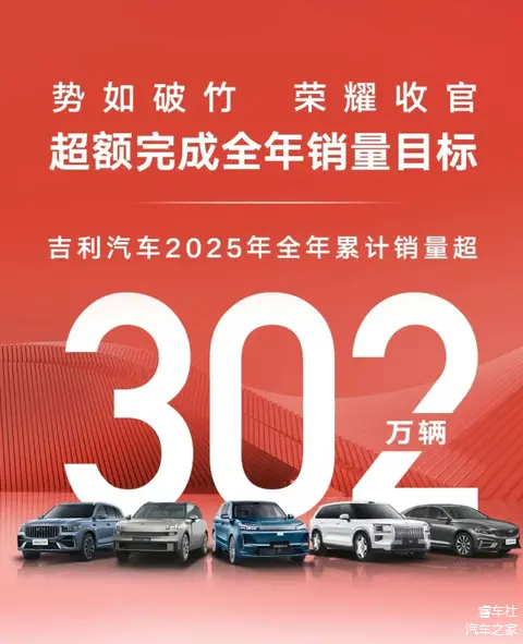 吉利汽车攻势凶猛,2025年全年销量302万辆,同比增长39%,超额完成全年目标,这个数据超过奇瑞,排名国内第二,仅次于比亚迪。