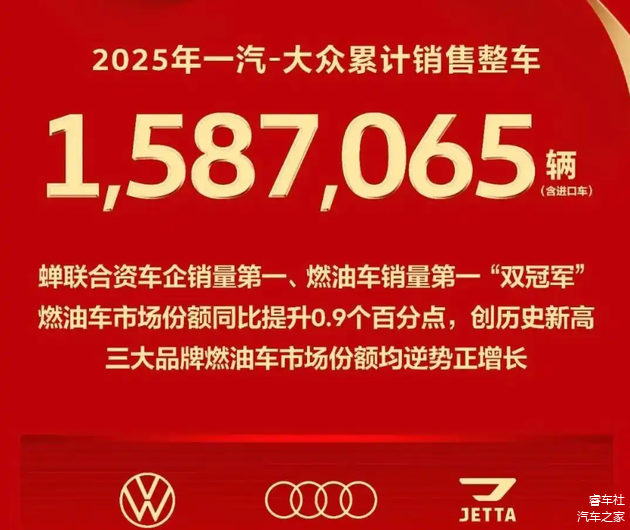 一汽-大众2025全年整车销量1,587,065辆(含进口车),占据合资阵营销冠的位置。当然和比亚迪,长安,奇瑞和吉利的差距已经被大幅度拉开,目前一汽-大众依然以燃油车为主,旗下三大品牌表现不一。