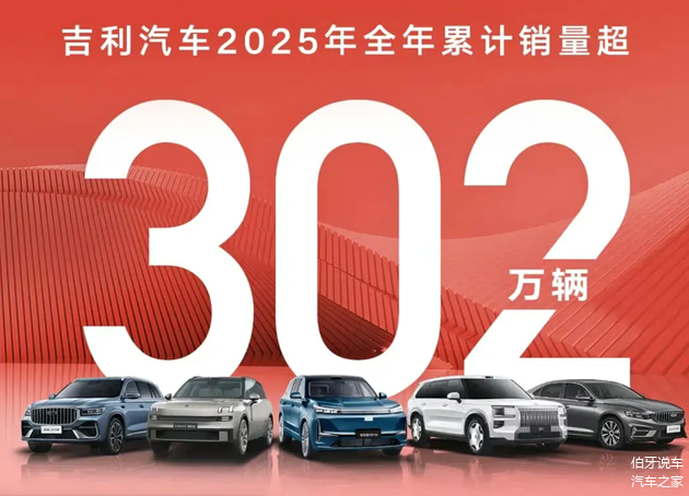 吉利全年销量302万台,同比增长39%,超额完成300万辆目标。