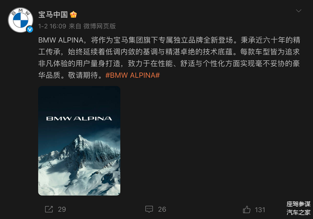 近日,宝马中国官方微博发文——“BMW ALPINA,将作为宝马集团旗下专属独立品牌全新登场。秉承近六十年的精工传承,始终延续着低调内敛的基调与精湛卓绝的技术底蕴。每款车型皆为追求非凡体验的用户量身打造,致力于在性能、舒适与个性化方面实现毫不妥协的豪华品质。敬请期待。”