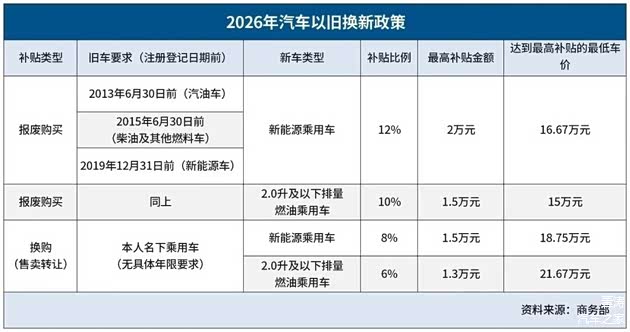 商务部等部门发布了关于2026年汽车以旧换新补贴实施细则。汽车报废更新方面,报废本人名下乘用车后购买新能源乘用车的个人消费者,可获得新购车车价12%的补贴,最高不超过2万元;购买2.0L及以下排量燃油车的消费者,可获得新购车车价10%的补贴,最高不超过1.5万元。汽车置换更新方面,个人消费者转让登记在本人名下的乘用车,购买新能源乘用车补贴车价的8%,最高不超过1.5万元;购买2.0L及以下排量燃油乘用车补贴车价的6%,最高不超过1.3万元。