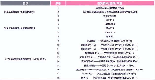 2025年12月19日落幕的2025中国汽车工业质量大会上,奇瑞集团一举摘得18项权威大奖,为整个2025年的技术之旅划上一个完美的句号。