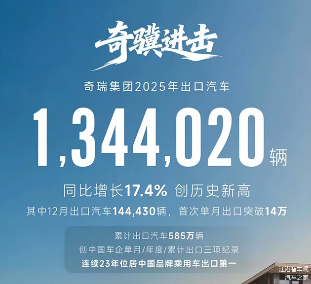 2025年,奇瑞汽车创下了中国品牌车企首家单月出口突破14万辆、首家年度出口超过134万辆、首家累计出口突破500万辆、首家连续8个月出口超10万等多项历史第一,出口市场覆盖全球120多个国家和地区,全球累计用户1853万。