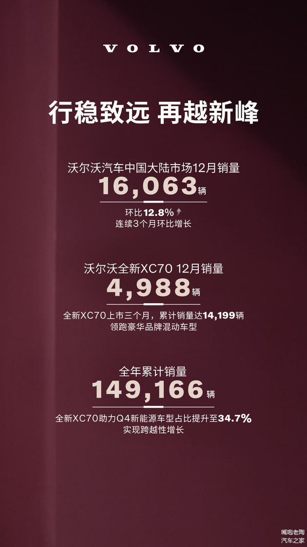 【1月5日】沃尔沃汽车今日公布2025年12月销量数据,中国大陆市场共计售出16,063辆,环比上涨12.8%,全年累计销量达到149,166辆,展现出稳健的市场表现。