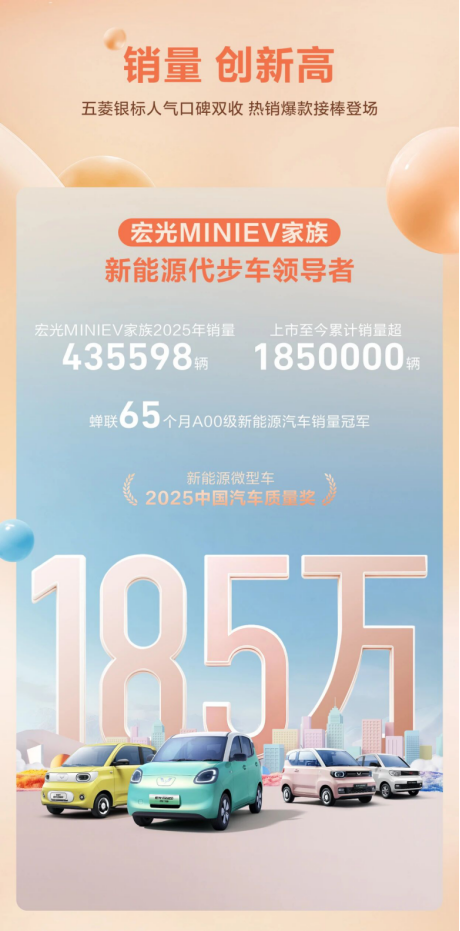 就在近日,宏光MINIEV在2025年的销量也公布了,达到了435598台,累计销量超185万台,稳居全球微型新能源汽车累计销量的冠军,表现一如既往的劲爆,并荣获“新能源微型车2025中国汽车质量奖”。它之所以这么受欢迎,是因为产品力领先对手好多,并且还推出了A00级唯一的四门版。