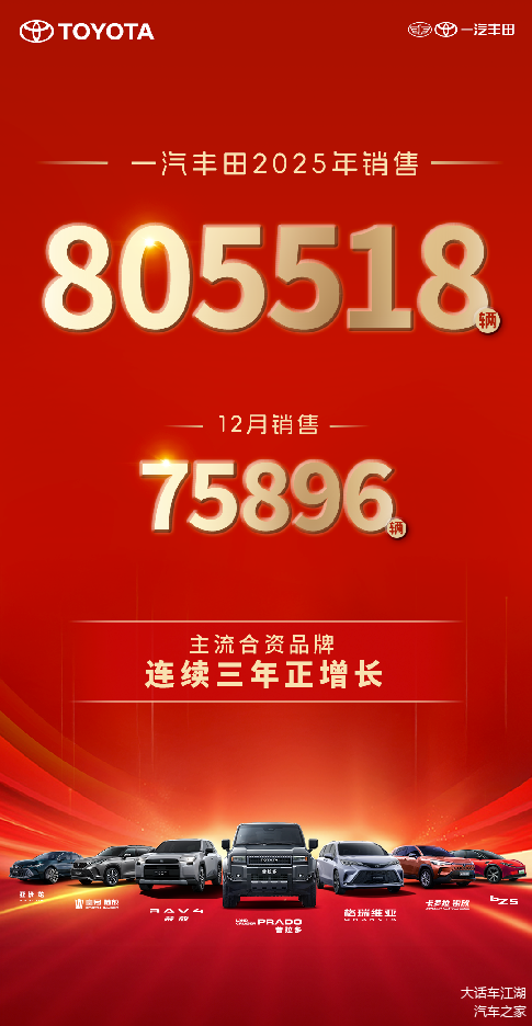 回首未及尘封的2025年,机遇与挑战并存,笃定与奋进同在;一汽丰田不负春华,硕果累累,全年销售新车805518辆,成为连续三年实现正增长的主流合资品牌,品牌向上向新的势头更加明显。其中TNGA-K平台以上高端车型销售487426辆,同比增长12%,占比达61%;智能电混双擎全年销量380100辆,同比增长14%,占比达47%。明星车型皇冠陆放全年销售59902辆,同比增长14%;RAV4荣放全年销售204272辆,同比增长6%;亚洲龙全年销售126703辆,同比增长39%,展示了强劲的向上势头。