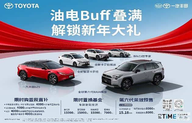 为了回馈广大用户的厚爱,开年之际,一汽丰田就推出了重磅福利。2026年1月1日-1月9日,全新智混卡罗拉、全新卡罗拉锐放、bZ3 智享家、bZ5可享4000元新春购置税补贴,其中bZ5置换用户额外享 4000 元置换补贴;普拉多、皇冠陆放、格瑞维亚等车型限时置换补贴至高 1.5 万元;第六代全新荣放2.0L 双擎精英版限时焕新价15.18万元,此外全系版本还可享购置税补贴礼及双保无忧礼各 6000 元。