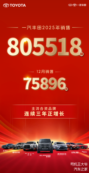 回首未及尘封的2025年,机遇与挑战并存,笃定与奋进同在;一汽丰田不负春华,硕果累累,全年销售新车805518辆,成为连续三年实现正增长的主流合资品牌,品牌向上向新的势头更加明显。其中TNGA-K平台以上高端车型销售487426辆,同比增长12%,占比达61%;智能电混双擎全年销量380100辆,同比增长14%,占比达47%。明星车型皇冠陆放全年销售59902辆,同比增长14%;RAV4荣放全年销售204272辆,同比增长6%;亚洲龙全年销售126703辆,同比增长39%,展示了强劲的向上势头。