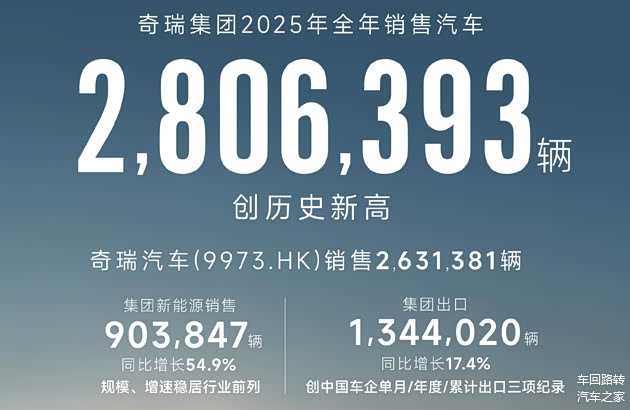 奇瑞集团在2025年累计销售汽车2,806,393辆,同比增长7.8%,其中新能源销量903,847辆,同比增长54.9%。奇瑞集团上市的全新产品中新能源占比超90%,推动了集团新能源销量的连涨。