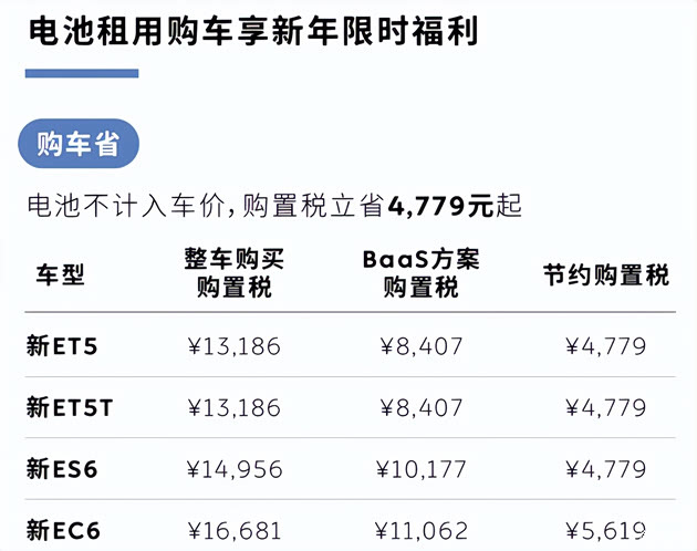 比如说蔚来在开年就宣布,从2026年1月1日起,车辆购置税优惠政策将由免征调整为减半征收。新政利好可车电分离的换电车型,用BaaS电池租用方案买蔚来、乐道、firefly萤火虫车型,可享额外购置税减免。依据产品价格,分别可节省1770元至9558元不等。