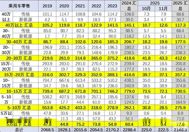 与此同时,进口车在2014年进口车达到143万辆峰值后下行,2024全年进口仅有70万辆,同比下降12%。2025年持续锐减,1-11月进口汽车45万辆,同比下降30%。国内乘用车零售市场,30万元以上的车型过去几年持续增长,但从2024年增速放缓,2025年明显下滑。