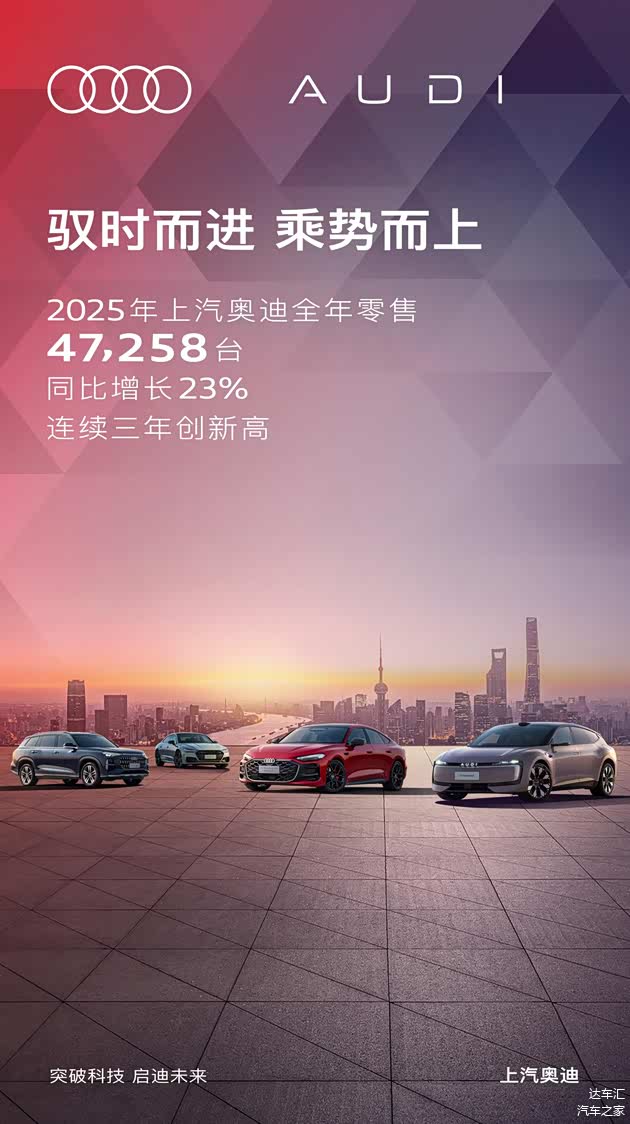 上汽奥迪对外公布 2025 年全年零售业绩达47258台,数据显示其全年零售量达 47258 台,同比增长 23%,顺利实现连续三年稳健增长,在豪华车市场中展现出稳定的发展态势。