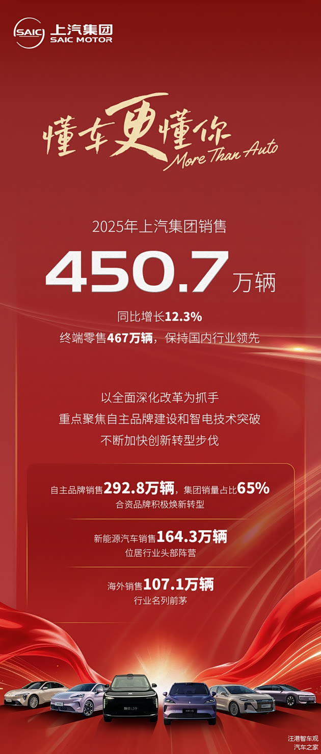 所有战略的最终价值,都需要市场的检验。2025年的年终数据,为上汽这一年的“破界与通变”提供了最有力的注脚,也让“全面深化改革”从一个口号变成了可触摸的现实。毫无疑问,在2025年,上汽集团收获了巨大的成功,在全年销售整车450.7万辆,同比增长12.3%,终端零售销量达到467万辆,继续保持国内行业领先之外,我们还看到了更多亮点。
