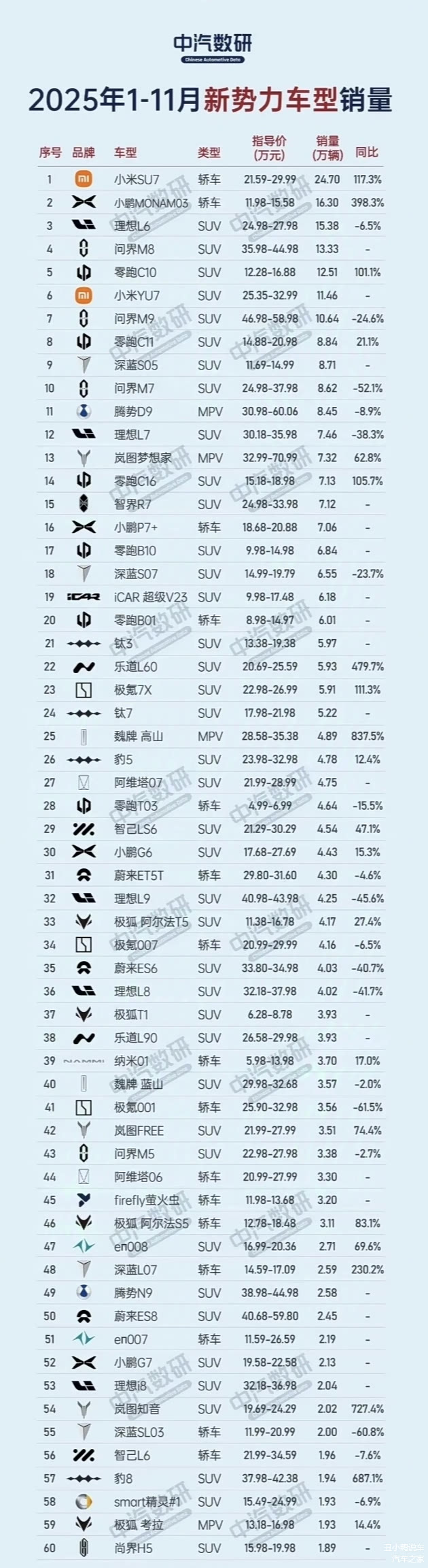 这是2025年1-11月新势力车型累计销量排行榜TOP60,真是不看不知道,一看吓一跳,本以为排名第一的车型会来自理想问界零跑这些卖车很多年的新势力车企,然而比较扎心的是造车最晚的小米的su7排名第一,卖了24.7万台。让友商更扎心的是,60款车型中,有且只有su7的销量突破17万台,其它车型全在17万台以下,su7确实有点不给竞品车型一点面子啊。