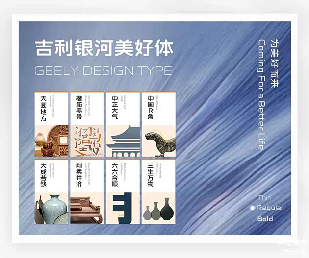 吉利设计专为银河品牌开发了一套“吉利银河美好体”,为品牌识别定下了标准,既将“科技与优雅”的品牌人格可视化,无论是天圆地方还是大成若缺,每个字符的笔画与间距都承载了品牌想传递的审美意志;