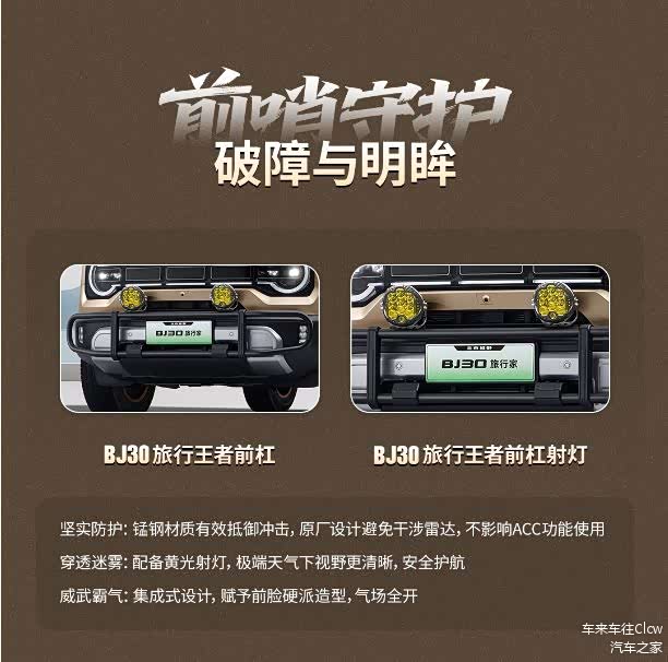 BJ30旅行王者前杠,具备有效防护性能,采用锰钢材质打造,可有效抵御行驶过程中的各类冲击;其原厂适配设计可避免与雷达系统发生干涉,确保ACC自适应巡航功能正常运行。同时,套件配备的黄光射灯具备强穿透性,即便在迷雾等极端天气条件下,也能显著提升视野清晰度,为出行安全保驾护航。前杠与射灯的集成式设计,赋予车辆前脸硬朗大气的硬派造型,尽显气场十足。