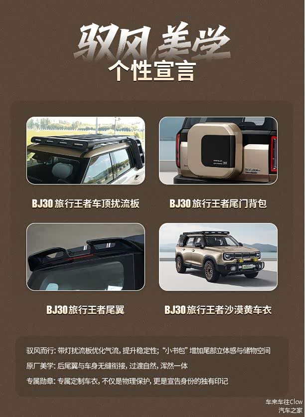 BJ30旅行王者车顶扰流板可优化车身周围气流分布,进一步提升行驶稳定性;尾门背包不仅增强了车辆尾部的立体视觉效果,更拓展了额外储物空间;尾翼与车身无缝衔接,过渡自然、浑然一体,尽显设计质感;专属定制大漠金车衣,既为车身提供物理防护,更为车辆彰显独特身份。