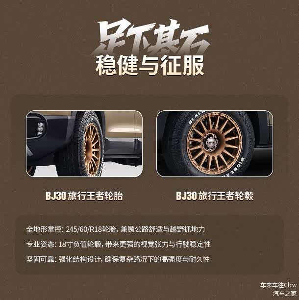 BJ30旅行王者套件搭载245/60R18规格轮胎,兼顾公路行驶的舒适性与越野场景的抓地性能,助力用户实现全地形场景掌控;搭配18寸负值轮毂,不仅赋予车辆更强的视觉冲击力,更通过强化结构设计,确保在复杂路况下具备出色的高强度与耐久性,进一步提升行驶稳定性。