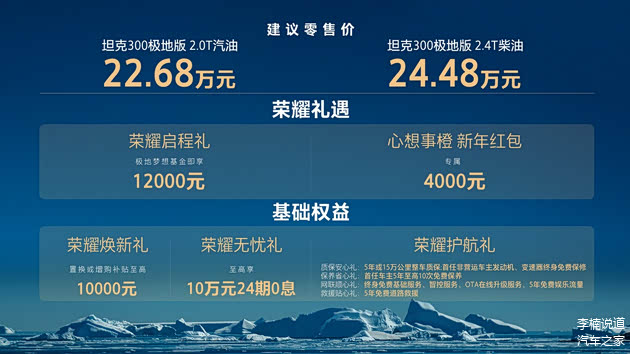 2025年12月11日,在坦克300全球用户达成50万之际,坦克300极地版正式上市。官方建议零售价,坦克300极地版2.0T汽油22.68万元,坦克300极地版2.4T柴油24.48万元,并推出荣耀启程礼、心想事橙新年红包和多项基础权益等多重购车礼遇。