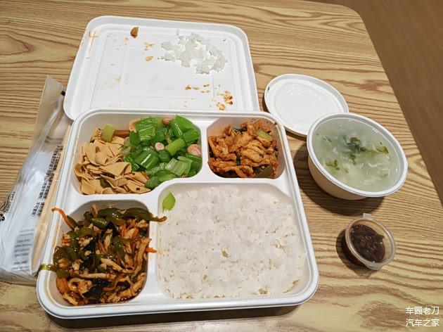 正好中午赶上饭点了,于是进入薅羊毛的环节。可能很多人不知道,不管你是到店保养、维修还是选车试驾,只要提前预约,都能提供免费午餐。我特意问过,哪怕不是比亚迪车主,提出来人家也不会拒绝。餐食算不上多丰盛,但也有荤有素,放在火车上卖40块钱肯定是没问题的。这里着重推荐一下它这的拌饭酱,好像叫“那口酱”,贼下饭!我有糖尿病,白米饭不敢多吃,因为那口酱没控制住,血糖给我干到14.9。