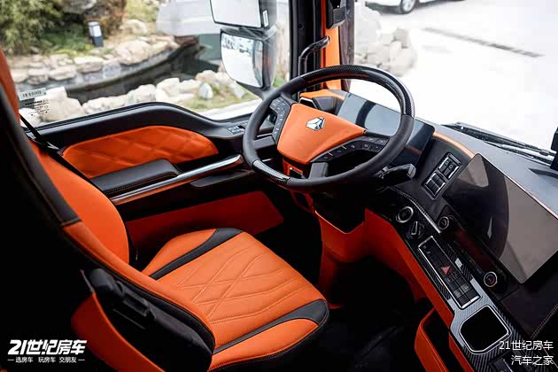 走进车内,才懂什么叫“移动双层大别墅”。驾驶室采用爱马仕橙全包覆,高级感扑面而来,主副驾气旋座椅过滤颠簸,遥控器一键车身找平,长途旅行也能惬意舒适。