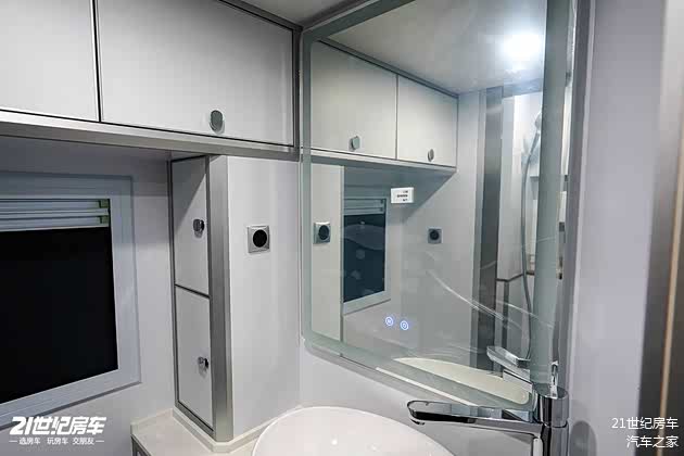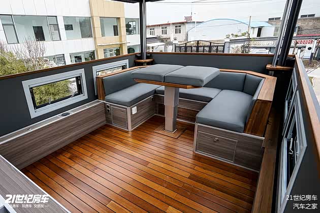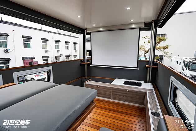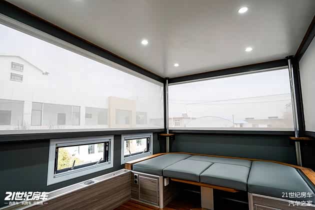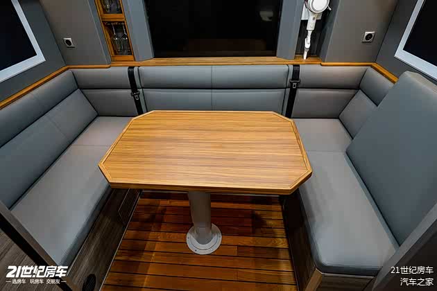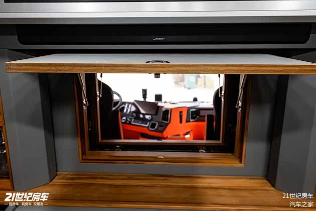 一层生活区布局精妙,前方可升降电视,降下后与驾驶室无障碍沟通;U型卡座沙发配备安全带,整车荷载5人,放平即变双人床。