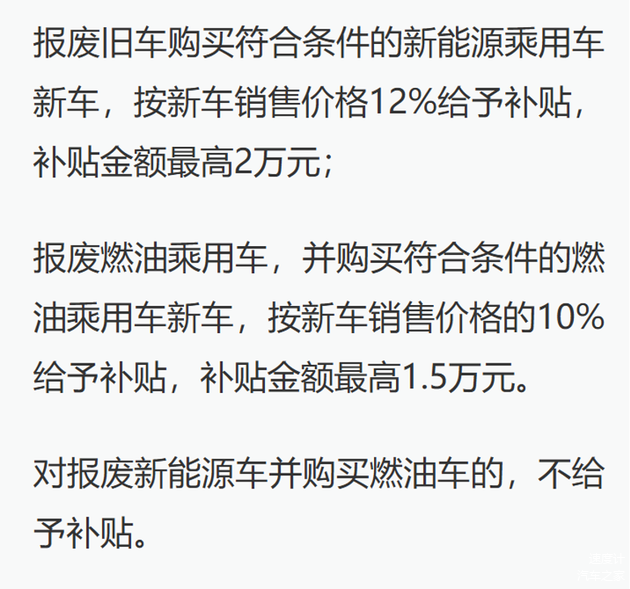 第一个是“报废更新”,这条路,国家给的计算系数高,买新能源车补新车发票价的12%,最高两万;买2.0升以下的燃油车,补10%,最高一万五。