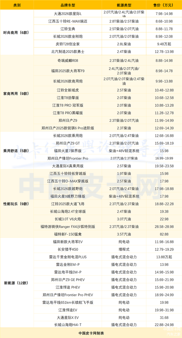 2025年,国内皮卡新车市场呈现出清晰的场景化、圈层化细分特征。时尚商用与家商两用依然构成了市场的基本盘,约15款车型主打高性价比和多用途。例如2026款商用炮、江铃全新域虎等,价格集中在8-15万元区间,提供丰富的汽柴油动力和手动/自动变速箱选择,以满足创业者和中小商户的核心需求。
