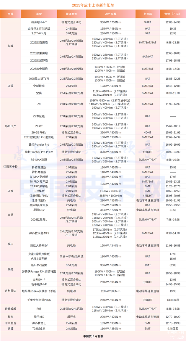 2025年,中国皮卡市场迎来变革,出口首次超越内销,成为增长主引擎,新能源车型销量同比激增超三倍,智能化、乘用化趋势显著。同时,新车市场井喷,全年超过40款全新皮卡或换代、升级车型涌入市场,竞争激烈程度空前。从经济实用的商用工具,到性能强劲的玩乐利器,再到科技感十足的新能源车型,国内皮卡市场正加速向多元化、高端化方向转型。