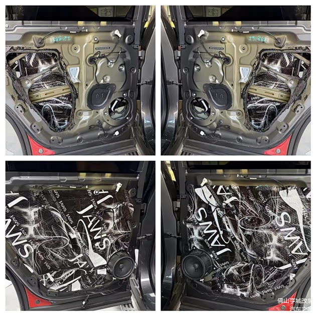 在材料选择上,四门隔音采用大白鲨国际版三层隔音材料,该材料具备出色的隔音隔热与减震性能,三层结构能更高效地阻隔外界噪音传入座舱。施工过程中,细节把控彰显专业实力。前门板与后门板的内层隔音施工细致入微,技师严格按照原厂结构进行精准裁剪与贴合,确保隔音材料与门板紧密贴合,不留缝隙,有效阻断噪音通过门板缝隙传入。